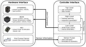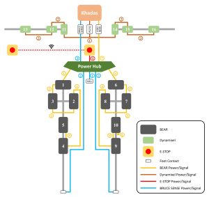 BRUCE is fully untethered. All the electronics are directly mounted onto the torso for easy installation and better weight distribution. Khadas Edge2 with RK3588S is utilized as the onboard computing resource. A 14.8V 3000mAh Li-ion battery is used to power the whole system with a running time of approximately 20 minutes. For the sake of safety during operation, a wireless E-Stop built in-house is mounted onboard as well to put BEAR actuators into damping mode in emergencies. In total, BRUCE has a net weight of around 4.8 kg. A hardware overview and schematic diagram of BRUCE are shown in the images.